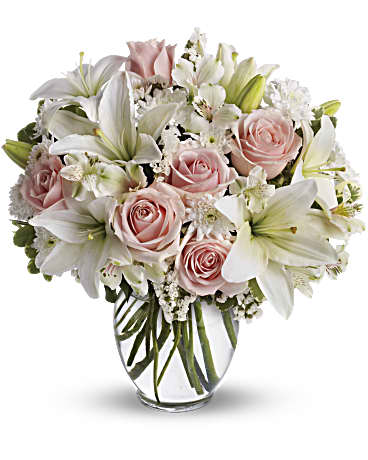When you want your best wishes to arrive in high style, go with this fashionable, feminine bouquet! Full and fragrant, it gathers soft pink roses with white lilies, alstroemeria and mums into a rounded ginger vase. Light pink roses, white asiatic lilies, white alstroemeria and white cushion spray chrysanthemums are mixed with white statice and variegated pittosporum in a clear, rounded vase. Orientation: All-Around