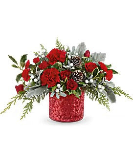 Teleflora's Magical Wish Bouquet brings holiday sparkle to life! Red blooms and festive greens shine in Teleflora's glittering Magical Wish Vase-a dazzling gift for Christmas or any winter celebration. Teleflora's Magical Wish Bouquet includes red spray roses, red carnations, and red miniature carnations. Accented with dusty miller, cedar, and variegated holly in Teleflora's Magical Wish Vase Orientation: All-Around