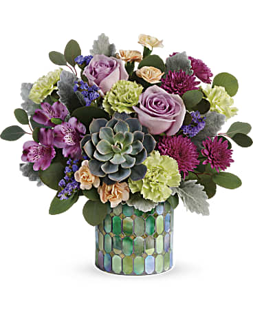 Inspired by stained glass, this unique mosaic glass cylinder lends an organic feel to this extraordinary jewel-toned bouquet of blooms and succulents! Purple alstroemeria, green carnations, peach miniature carnations, purple cushion spray chrysanthemums, and purple sinuata statice are arranged with silver dollar eucalyptus, dusty miller, and a large green echeveria succulent. Delivered in Teleflora's Marvelous Mosaic cylinder. Orientation: All-Around