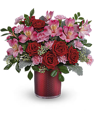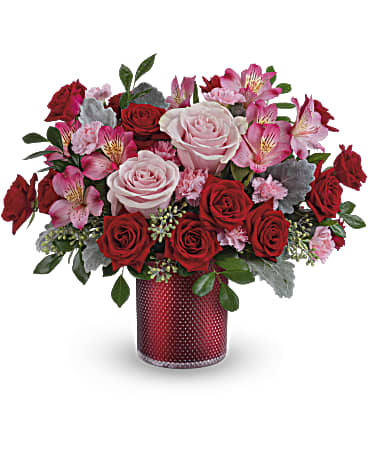 Embossed with an elegant diamond pattern and shimmering with a pearlescent finish, this glam glass vase makes their day extra special when filled with a beautiful red and pink bouquet. This arrangement includes red spray roses, pink alstroemeria, miniature light pink carnations, dusty miller, seeded eucalyptus and huckleberry. This red and pink bouquet is delivered in Teleflora's Scarlet Diamond Cylinder. Orientation: All-Around