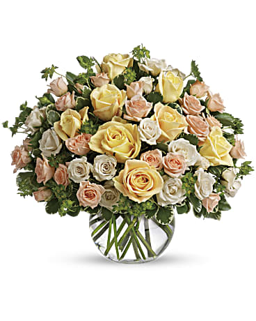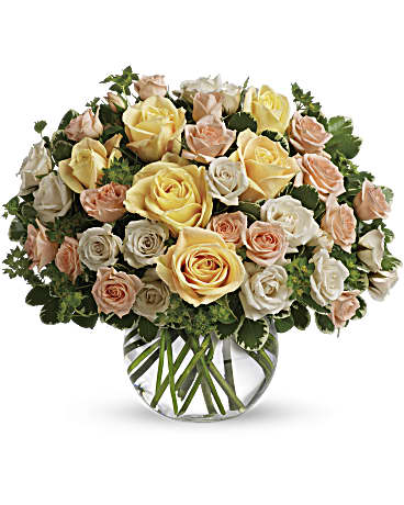 It will be a magic moment when this divine bowl of pastel roses is hand-delivered to someone special. Perfect for any occasion, the soft colors and variety of rose blossoms will soothe anyone's soul. Beautiful yellow roses, peach and white spray roses and greens are delivered in a clear glass bubble ball. The effect is magical. Orientation: All-Around
